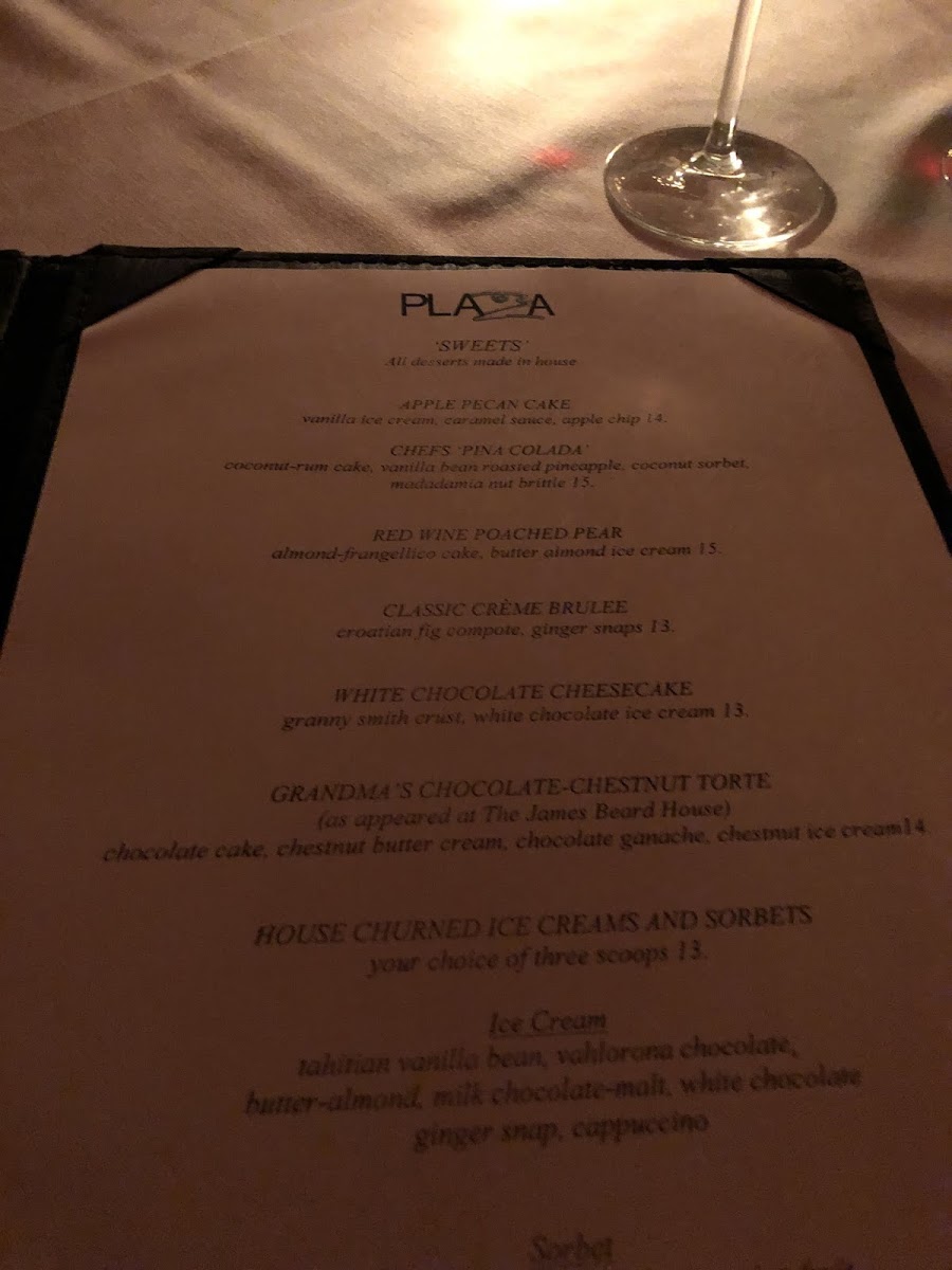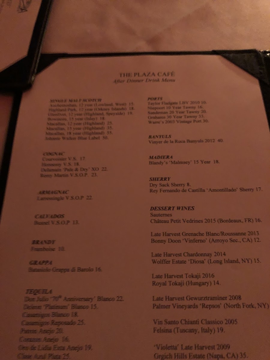From the first course, the menu at The Plaza Café offers a refined selection that sets the tone for the meal, with highlights like Montauk Pearl Oysters, the elegant Tuna & Crab Tian, and the vibrant Peruvian Ceviche, followed by perfectly seared Local Calamari and the rich Lobster‑Shrimp Seafood Sausage. For the main course, seafood lovers are treated to choices such as the delicately cooked Local Black Sea Bass, the indulgent Sword “Parm”, the flaky Icelandic Cod, the hearty Columbia River Wild King Salmon, and the succulent Local Golden Tilefish - each showcasing fresh, regional ingredients. Vegetarians are also considered with a thoughtful Vegetarian Tasting Menu that features a crisp Asian Slaw, ensuring there’s something satisfying for every palate. This menu balances classic and contemporary dishes, emphasizing quality and seasonality in every course.